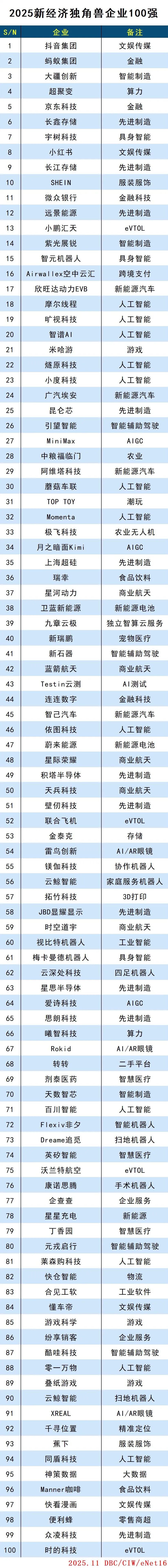2025新经济独角兽企业100强
