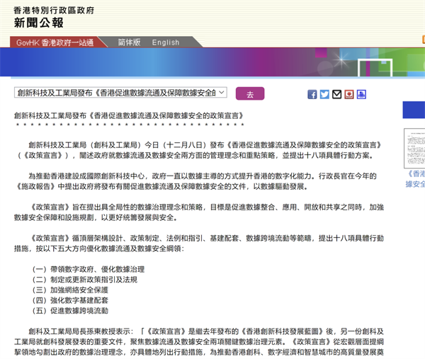 日前,香港特区政府创新科技及工业局发布《香港促进数据流通及保障数据安全的政策宣言》(简称《政策宣言》),阐述特区政府在数据流通和数据安全方面的管理理念和重点策略。