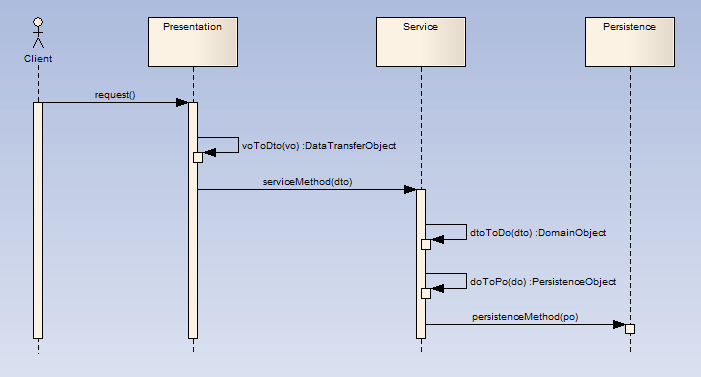 下面以一个时序图建立简单模型来描述上述对象在三层架构应用中的位置:
